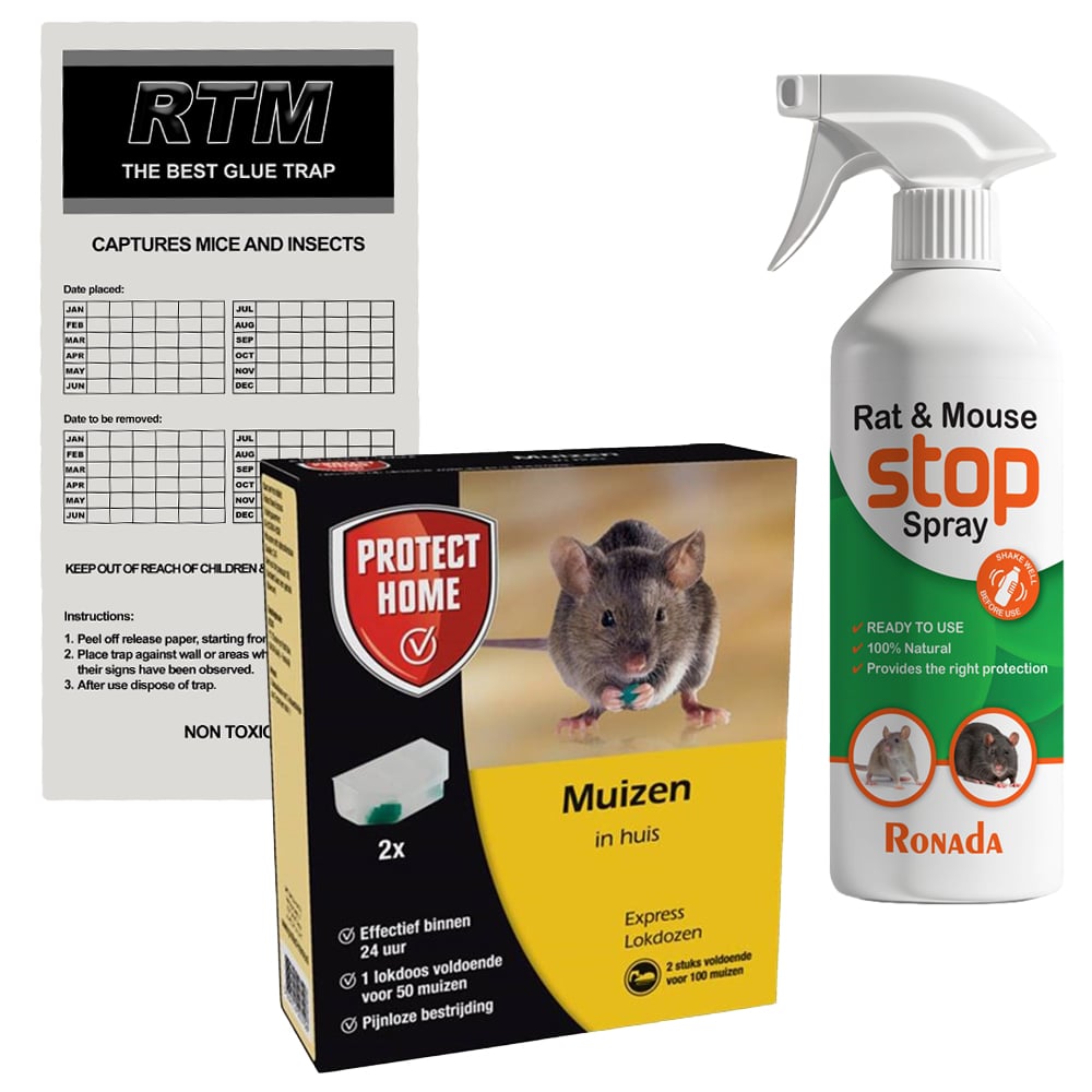 Deze bundel combineert verschillende methodes om muizenoverlast snel en doeltreffend aan te pakken. De bundel bevat Protect Home muizengif (2 stuks), een krachtig bestrijdingsmiddel dat helpt om muizen effectief te bestrijden op plaatsen waar zij actief zijn. Dit product is geschikt voor gebruik op strategische locaties waar muizen zich schuilhouden.