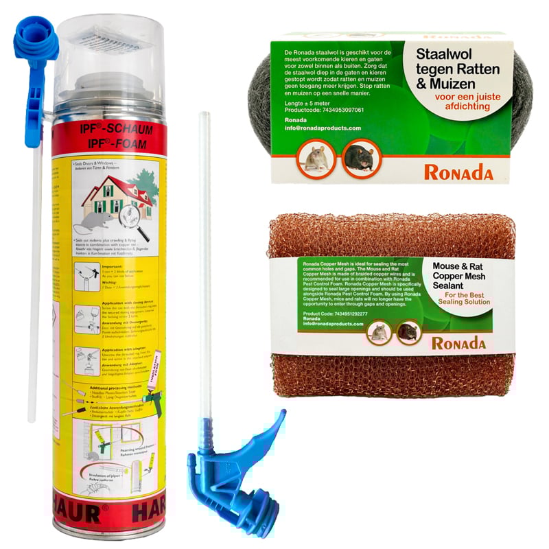 De Purschuim tegen muizen en ratten compleet is ontworpen voor zowel huishoudelijk als professioneel gebruik. Het purschuim is gemakkelijk aan te brengen met de spuitadapter en het weringsgaas en staalwol zorgen voor het optimale resultaat. Met deze combinatie kun je muren, vloeren, schuren en zolders effectief beschermen, zonder dat je meerdere losse producten hoeft aan te schaffen.