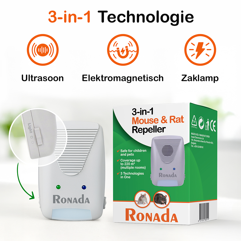 Deze Muizen en rattenverjager (3 in 1) bevat alle technieken die er zijn om muizen en ratten te verjagen. Het ultrasone geluid wat deze verjager produceert zit op een frequentie van 20 tot 30 kHz. Deze frequentie vinden ratten en muizen zeer vervelend en ze zullen daardoor de ruimte snel verlaten.