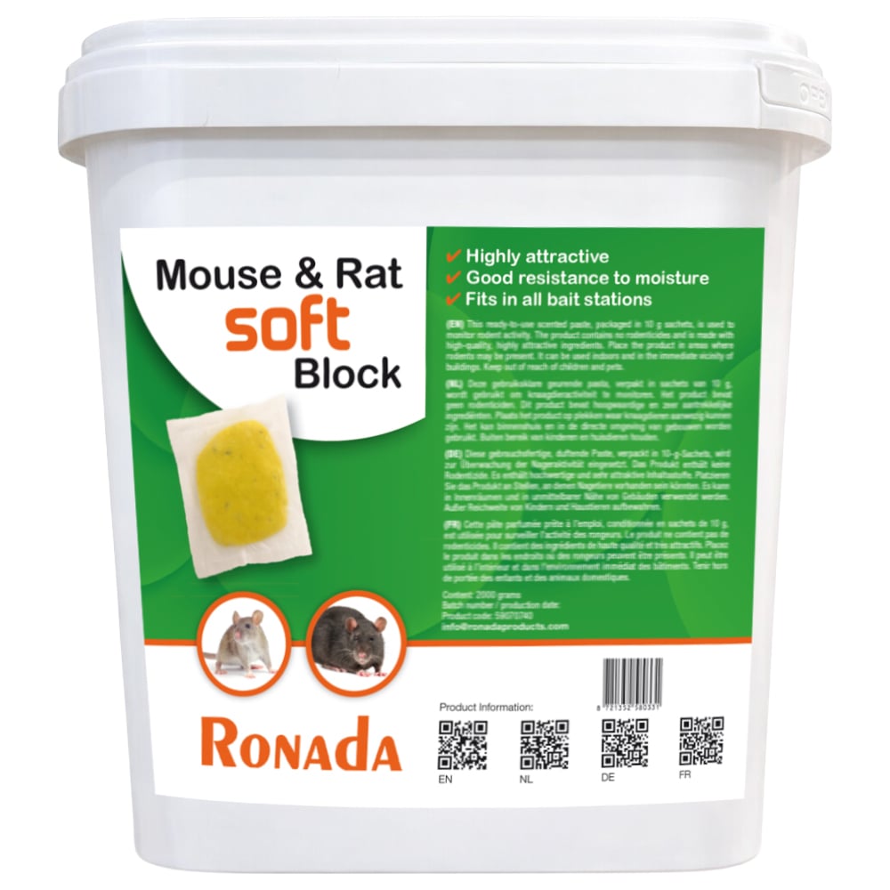 De Ronada Soft Blocks kunnen daarnaast ook gebruikt worden als lokmiddel, bijvoorbeeld om knaagdieren te monitoren of om activiteit in een bepaald gebied sneller zichtbaar te maken. Een veelzijdige oplossing voor wie op zoek is naar een aantrekkelijk en praktisch lokaas in soft block vorm.